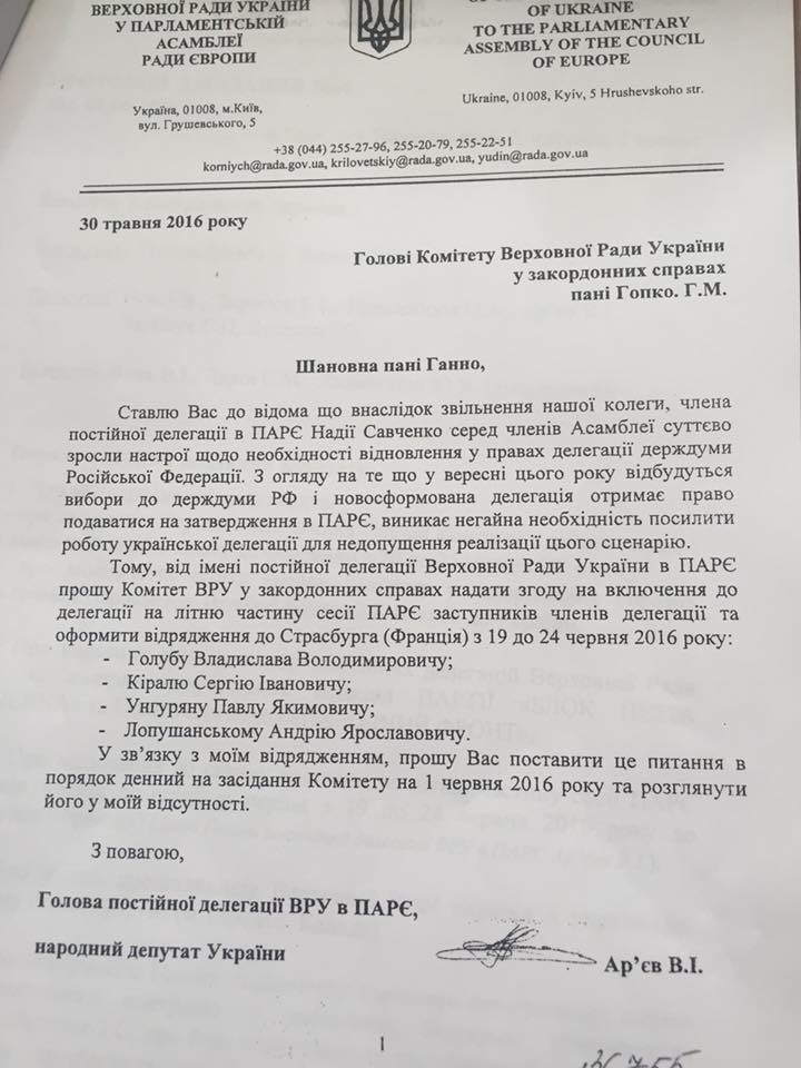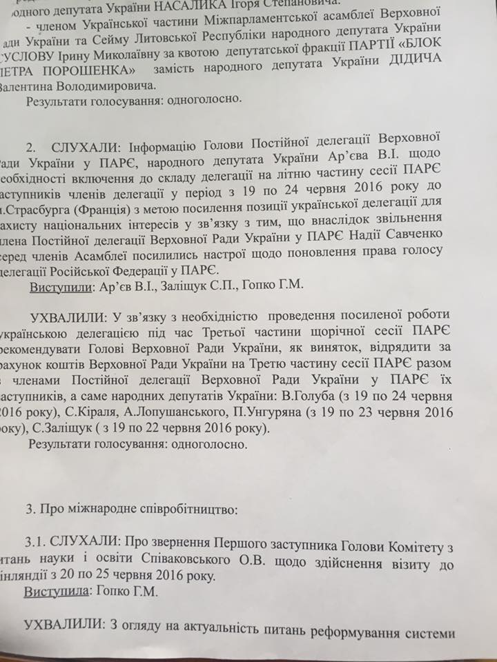Заступники членів ПАРЄ поїдуть на сесію державним коштом, але ...не усі. Дискримінація пов'язана з політичною позицією. Ар'єв домовився, що поїдуть лише ті, хто має лояльність до зовнішньополітичного курсу Порошенка в цілому і до Ар'єва особисто як голови делегації: Владислава Голуба (БПП), Павла Унгуряна (НФ), Андрія Лопушанського (БПП), Сергія Кіраля ("Самопоміч", Єгор Соболєв, друже, зверни увагу).