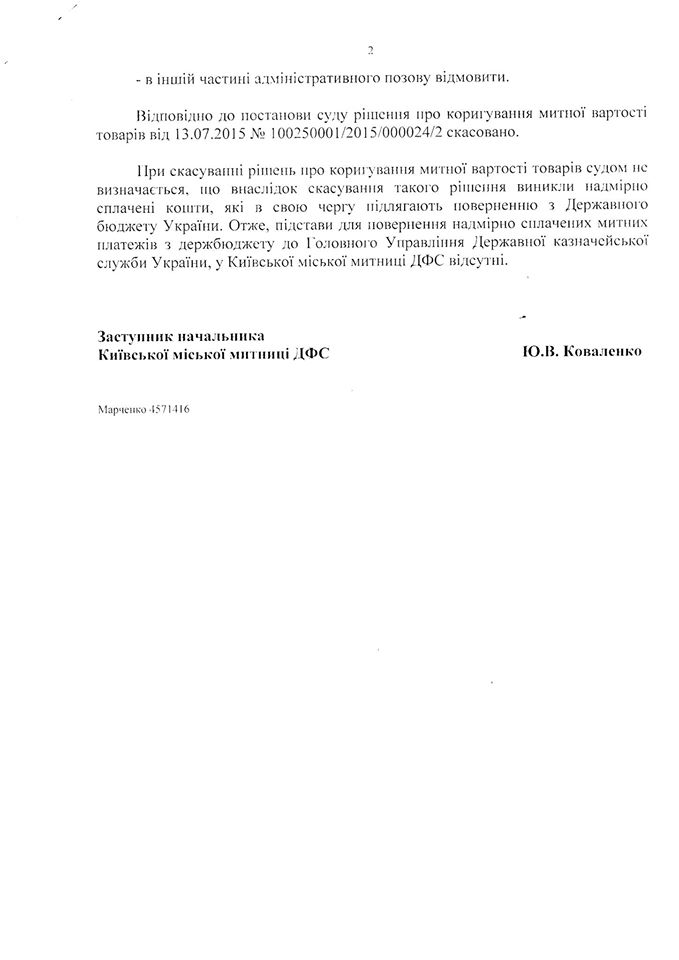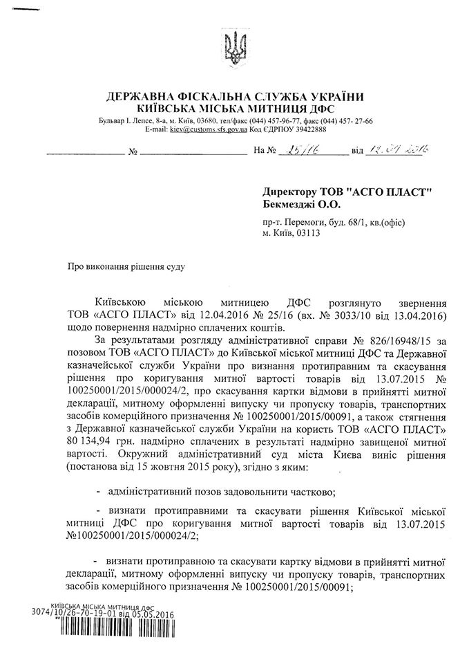 І тепер, навіть маючи на руках рішення суду, заступник керівника Київської міської митниці ДФС Юрій Коваленко не посоромився та не побоявся надіслати підприємцю офіційного листа, яким повідомив, що повертати йому вкрадені кошти ніхто не збирається. Мовляв незаконність дій митників, визнана у судовому порядку, не тягне обов’язку повертати неправомірно стягнуту суму.