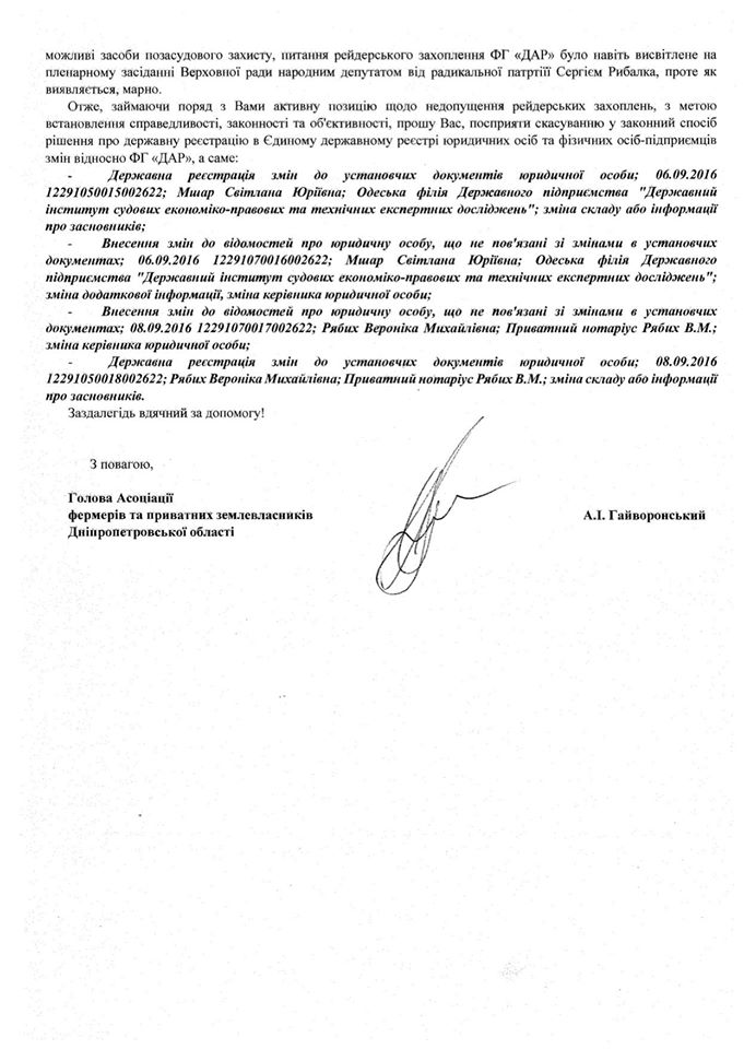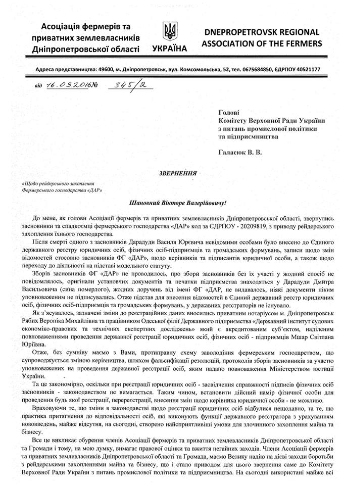 До мене звернулись Асоціація фермерів та приватних землевласників Дніпропетровської області і Асоціація фермерів та землевласників України з приводу рейдерського захоплення фермерського господарства «ДАР». Ситуація просто кричуща. Хто буде вкладати інвестиції в нашу економіку, коли те, що будувалось роками можна втратити за один день?!?