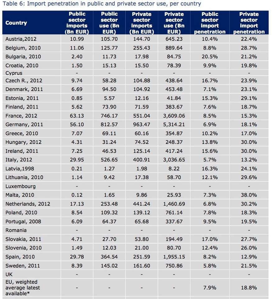 Імпортна складова держзакупівель в Україні оцінюється експертами на рівні 38%. В США та Японії цей показник менше 5%. Згідно свіжого звіту Єврокомісії проникнення імпорту у держзакупівлі ЄС - 7,9%.