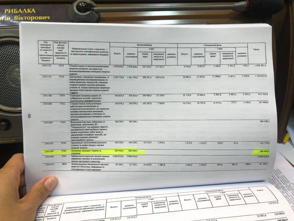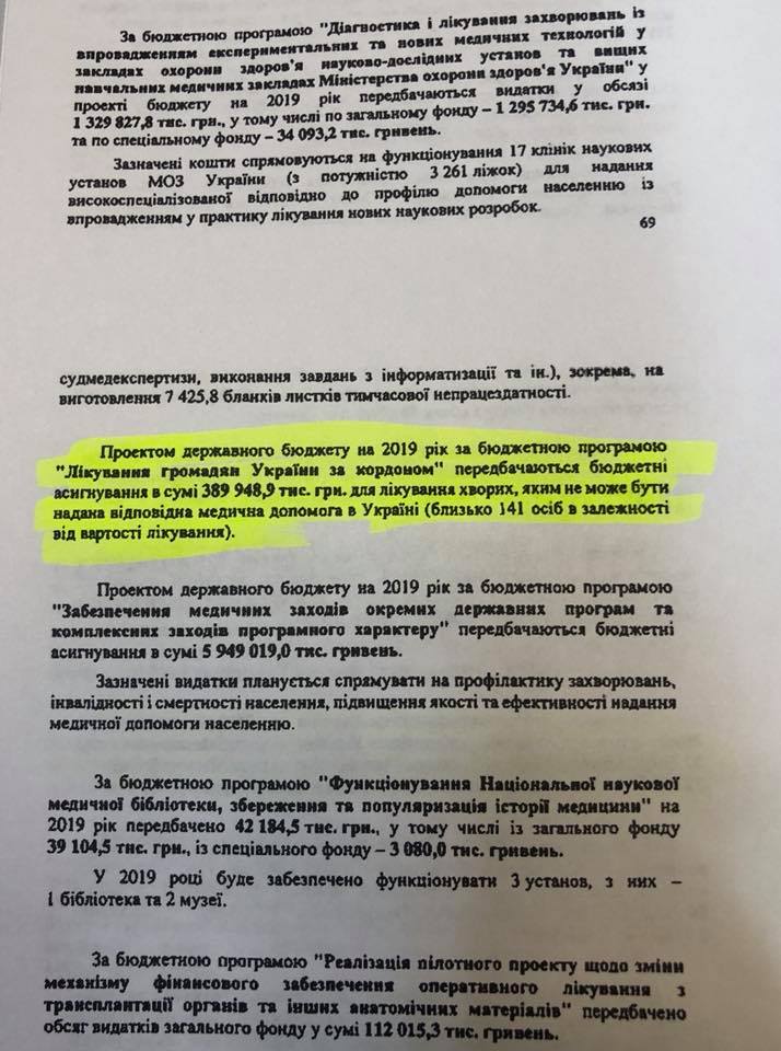 Це проект Закону України «Про державний бюджет України на 2019 рік», де ми сподівались побачити збільшення суми на програму «Лікування громадян України за кордоном». Але на жаль. Сума та ж сама, що і у 2018.