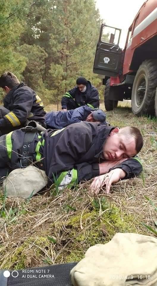 Більше тижня наші вогнеборці мужньо долають вогонь на Київщині, Житомирщині та у чорнобильській зоні. Найчастіше їм доводиться відпочивати між змінами саме так - спати на землі чи у наметі неподалік від місця загоряння. Вони щодня ризикують своїм життям!