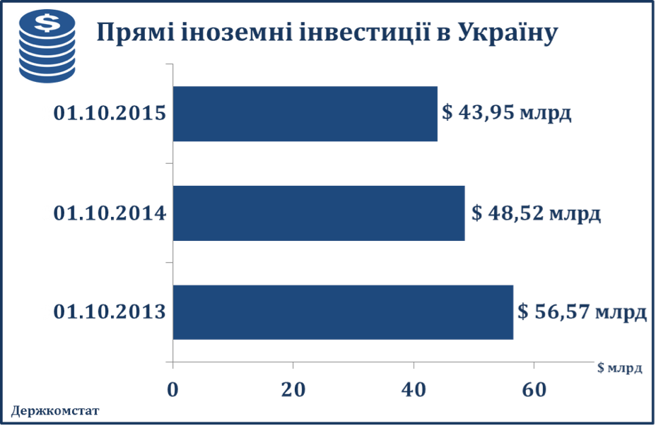 Щодо прямих іноземних інвестицій в Україну: станом на 01.10.2013 їх обсяг склав $56,57 млрд, на аналогічну дату 2014 року на $8 млрд менше – $48,52 млрд, а станом на 01.10.2015 ще на $4,57 млрд менше – $43,95 млрд. То де тут позитивна динаміка?