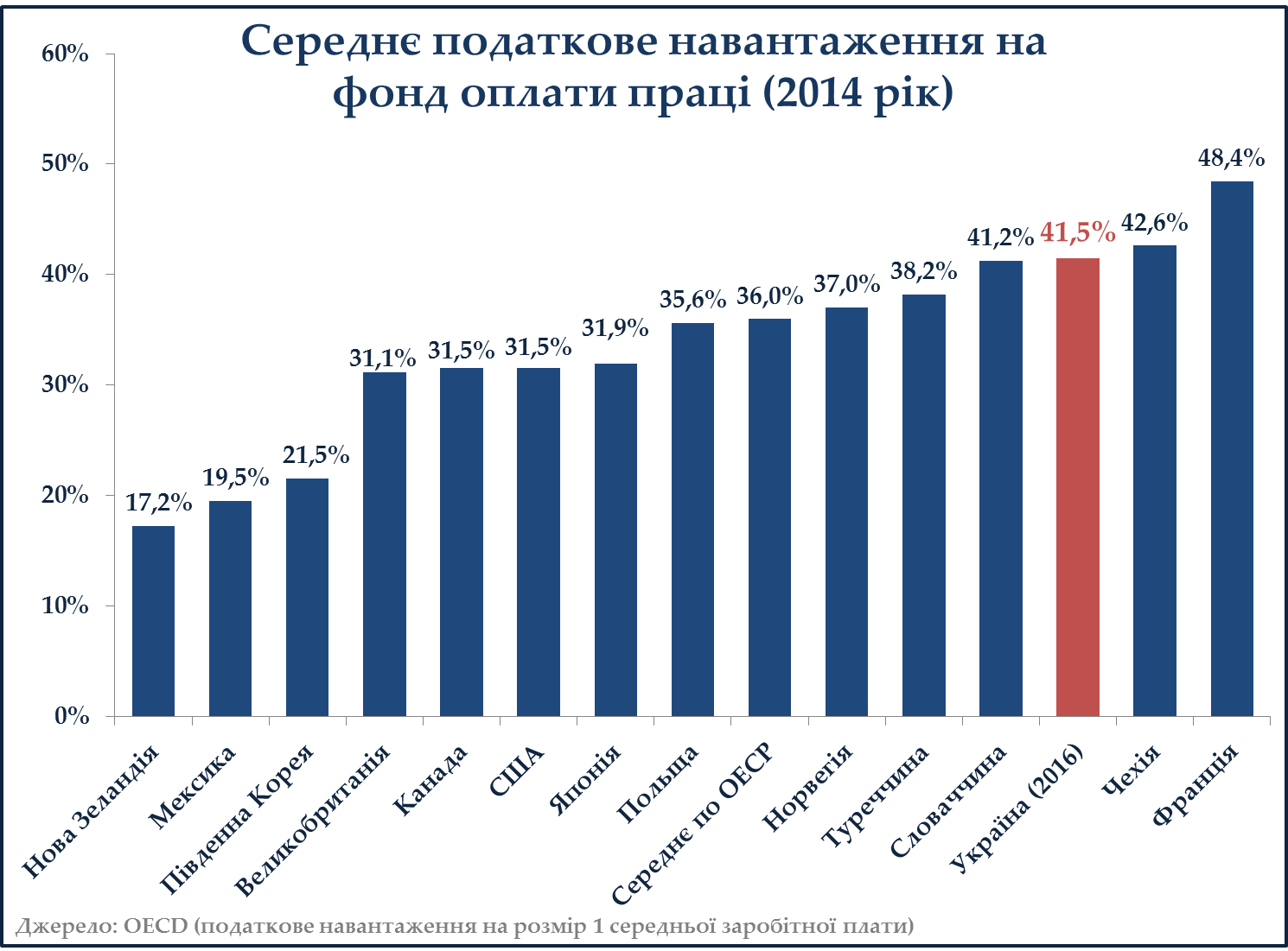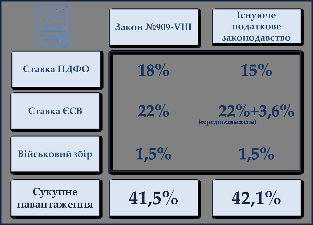 В результаті Україна отримала сукупне навантаження на фонд оплати праці в 2016 році 41,5% (18% ПФДО + 22% ЄСВ + 1,5% військовий збір). Нагадую, якщо б залишалось діюче на момент прийняття урядового Закону №909-VIII податкове законодавство, то сукупне навантаження на фонд оплати праці з 2016 року становило б у середньому 42,1% (15% ПДФО + 22% ЄСВ (роботодавець) + 3,4% ЄСВ(робітник) +1,5% військовий збір).