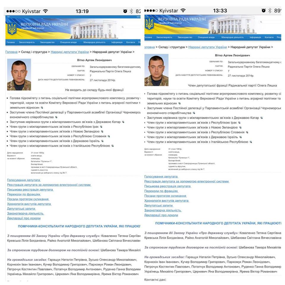 "Заява політичної тушки Вітка, прикупленої Третьяковим на замовлення Порошенка, про вихід із фракції РПЛ публічно була ним проголошена з парламентської трибуни 18 вересня. Письмову заяву про вихід Вітка з фракції РПЛ також зачитав головуючий на засіданні Гройсман. Про вихід Вітка з фракції як про доконаний факт повідомили усі вітчизняні ЗМІ", - перерахував усі законні підстави для припинення повноважень нардепа Вітка Олег Ляшко.