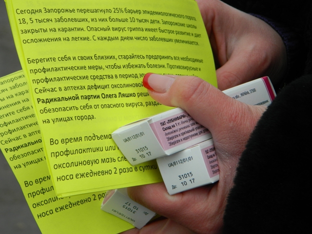 Понад 200 запоріжців отримали сьогодні можливіть захиститися від грипу, який поширюється запорізьким регіоном. У той час як на аптечних складах практично вичерпані запаси оксолінової мазі, а поставки профілактичного препарату затримуються, небайдужі до епідеміологічної ситуації в місті, запорізькі члени Радикальної Партії Олега Ляшка вийшли на допомогу тим, хто обмежений у коштах або в часі та не в силах придбати препарат і вчасно захистити себе від недуги.