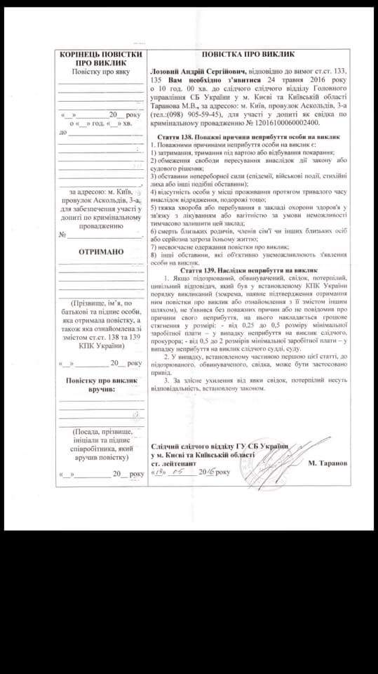 У вівторок, 24 травня, на 10.00 заступника лідера фракції Радикальної партії Андрія Лозового викликають на допит до Служби безпеки України. Про це сам Лозовий написав у своєму Facebook. За словами нардепа, він готовий іти на допит і йому немає чого боятися.