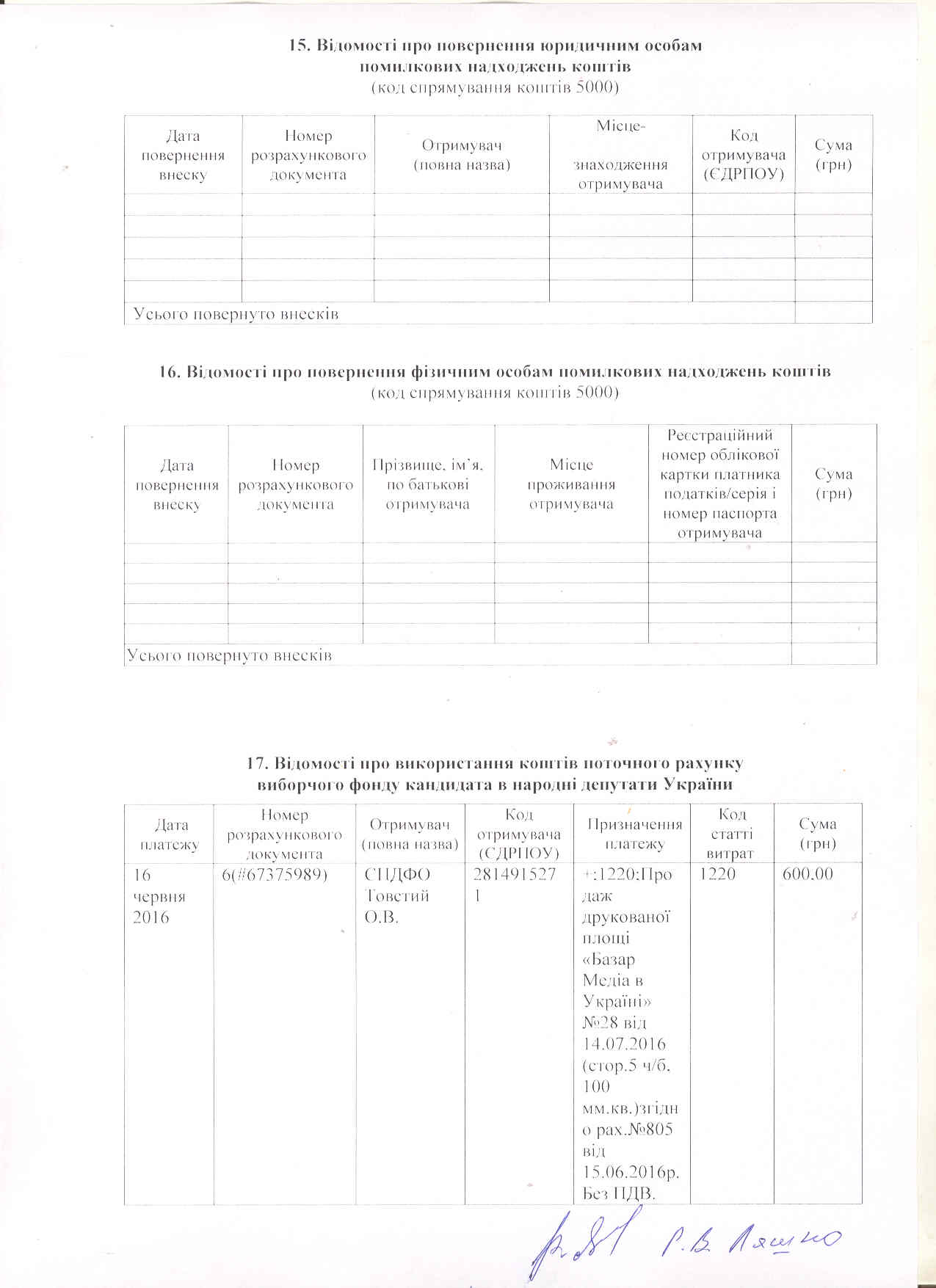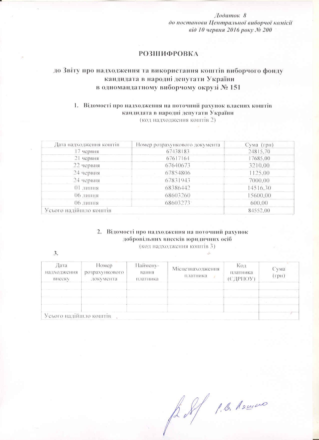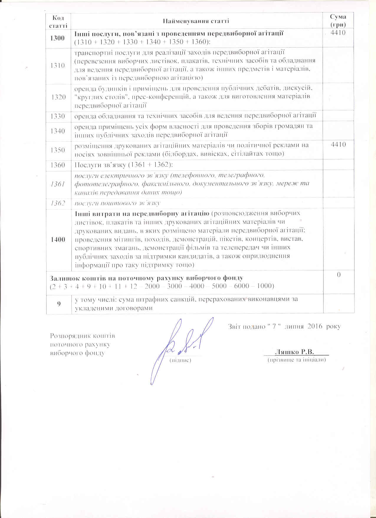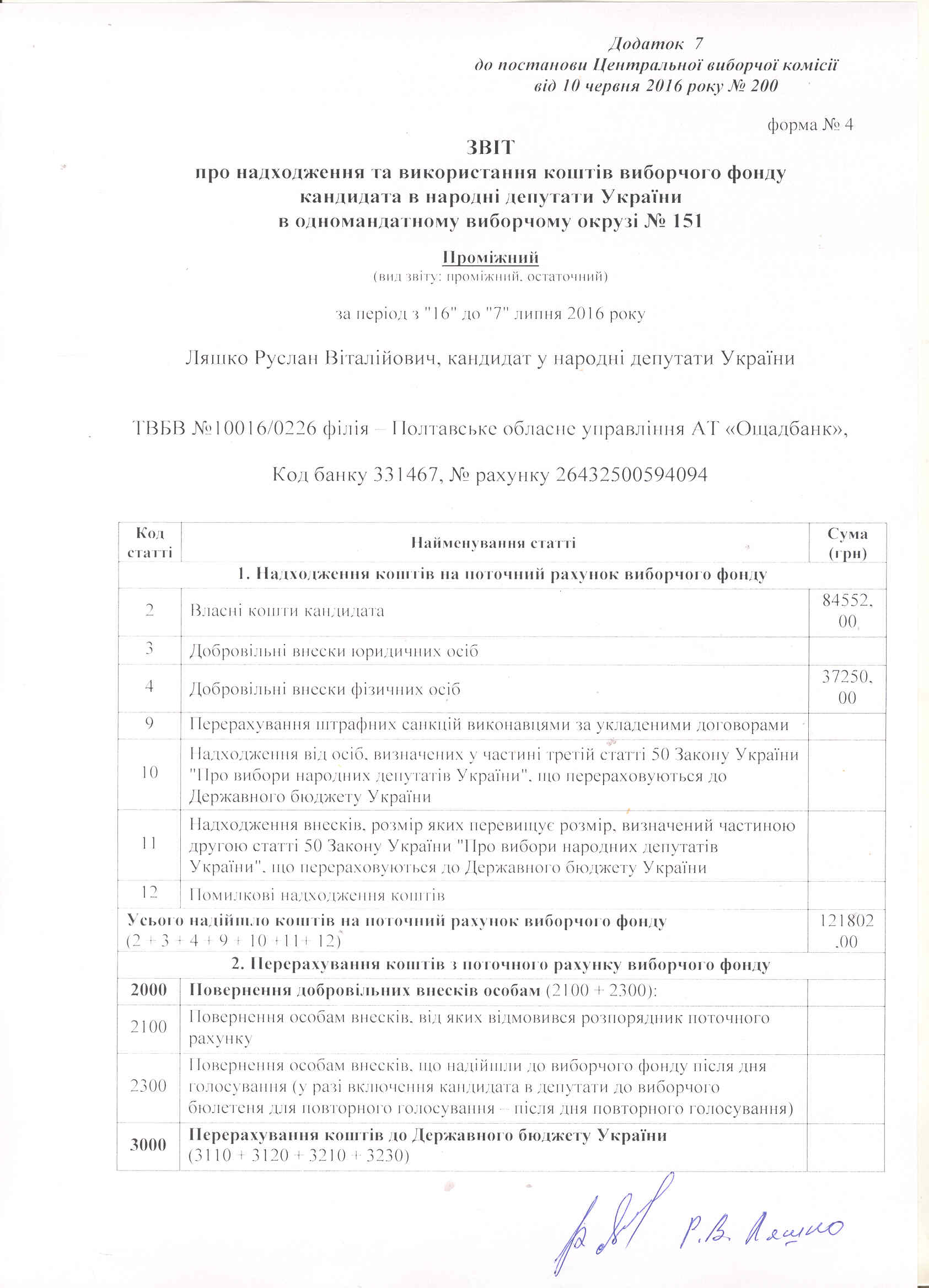 Звіт про надходження та використання коштів виборчого фонду кандидата у народні депутати України в одномандатному виборчому окрузі № 151 Ляшка Руслана Віталійовича на проміжних виборах народних депутатів України 17 липня 2016 року.