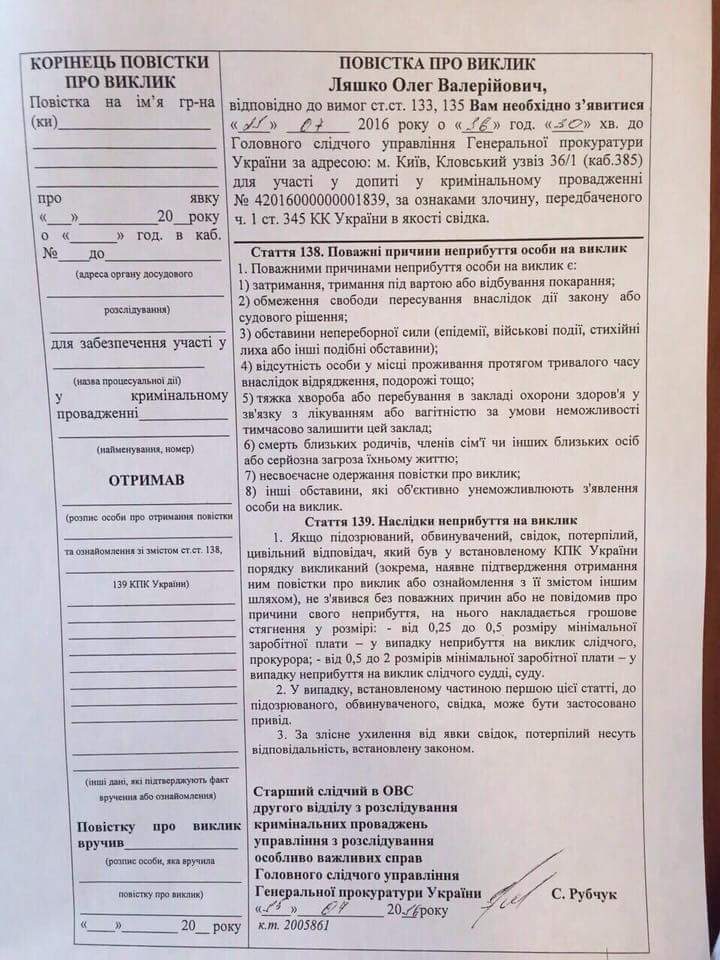 Допит лідера фракції Олега Ляшка відбудеться також 21 липня за тією ж адресою о 16.30.