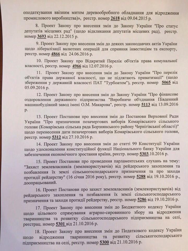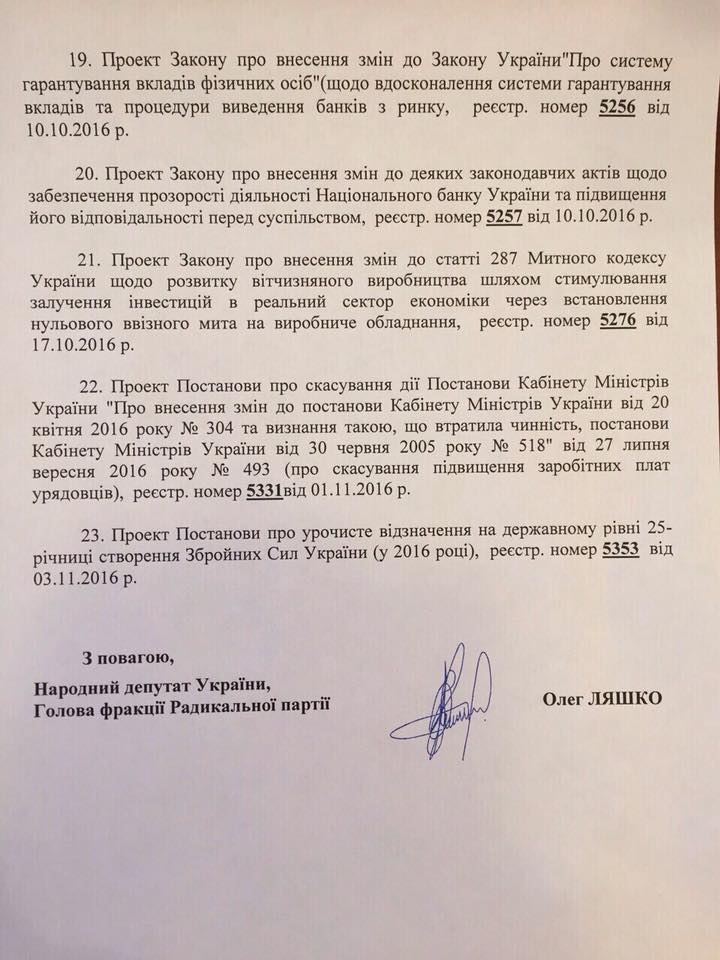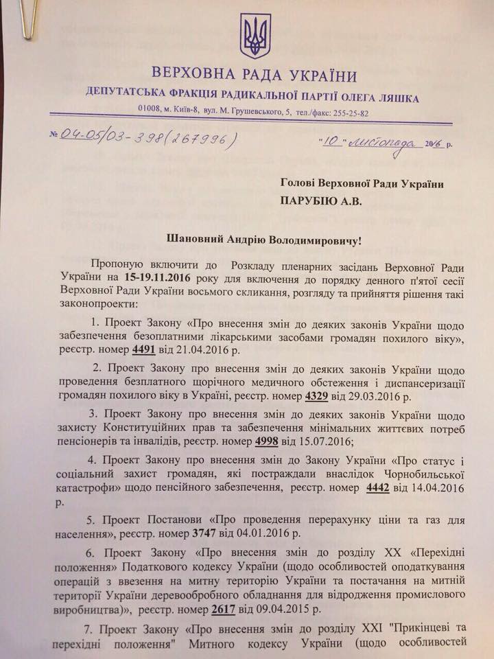 Політик оголосив вимоги фракції Радикальної партії до порядку денного наступного пленарного тижня. Серед них, зокрема, законопроекти про підвищення пенсій, про безкоштовне проведення медогляду та надання ліків пенсіонерам, про повернення соцгарантій чорнобильцям, про перерахунок ціни на газ для населення, про проведення парламентських слухань на тему рейдерства, про звільнення від мита деревообробного обладнання для відродження промислового виробництва, а також низка законопроектів щодо захисту селян.
