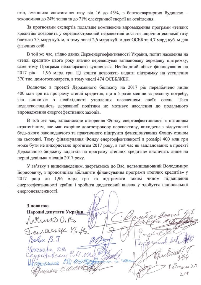 Разом з тим, згідно даних Держенергоефективності України, попит населення на «теплі кредити» цього року значно перевищував заплановану державну підтримку, саме тому Програма неодноразово зупинялася. Запропонований депутатами обсяг фінансування на 2017 рік дозволить надати підтримку на утеплення 370 тис. домогосподарств, в тому числі 474 ОСББ/ЖБК.