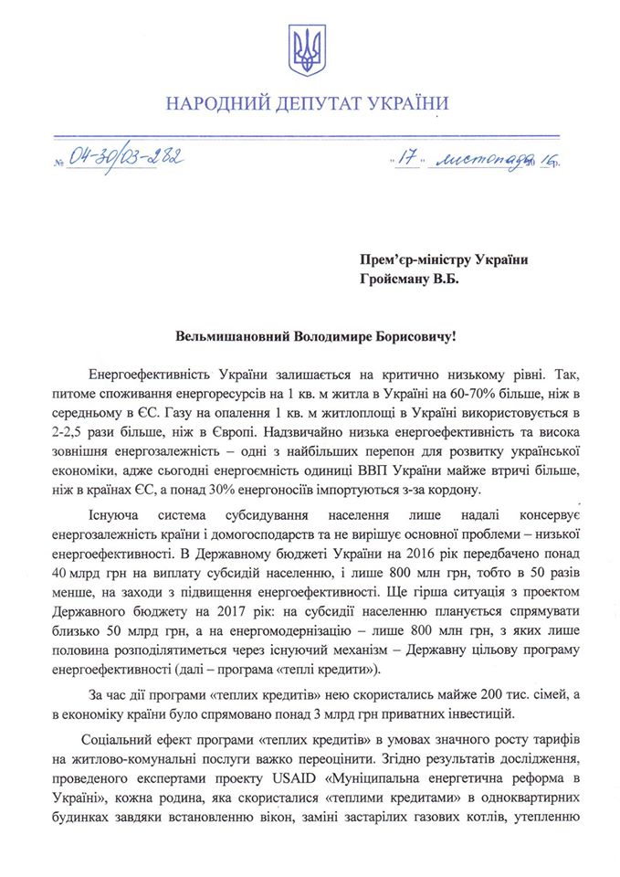 «Ми з Олегом Ляшком, Віктором Вовком, Олександром Домбровським та іншими колегами-депутатами звернулись до Прем'єр-Міністра щодо збільшення фінансування енергомодернізації до 2 млрд грн. Бо, якщо залишити все як є, коштів на "теплі кредити" вистачить лише на 2-3 місяці!» - поінформував нардеп.
