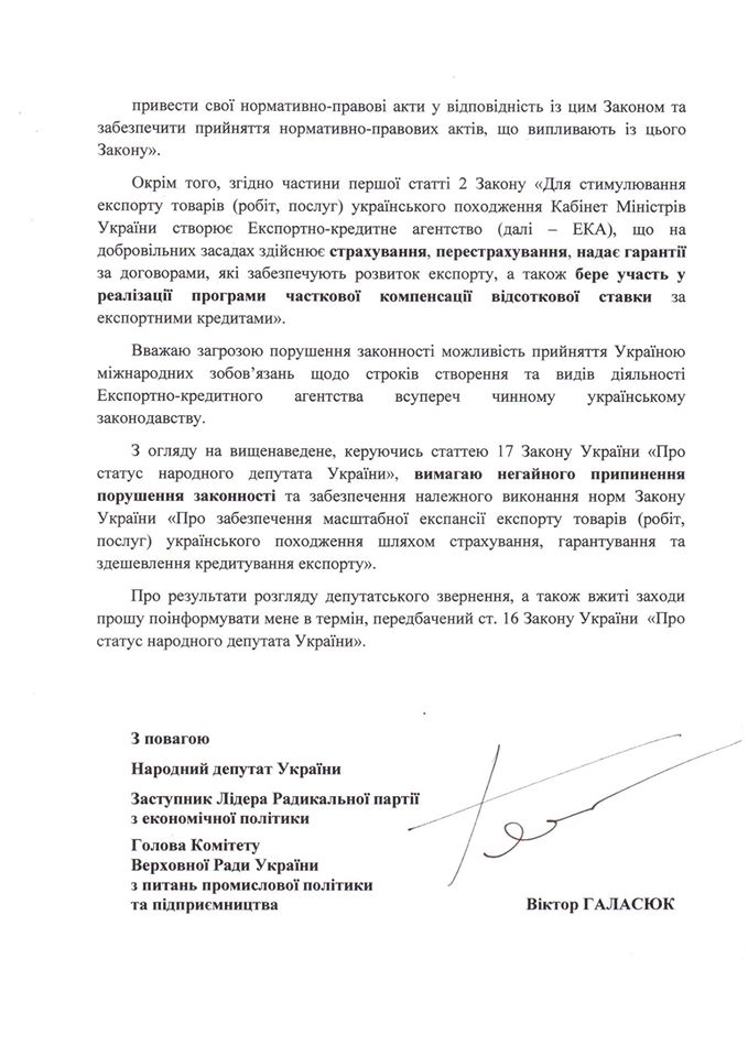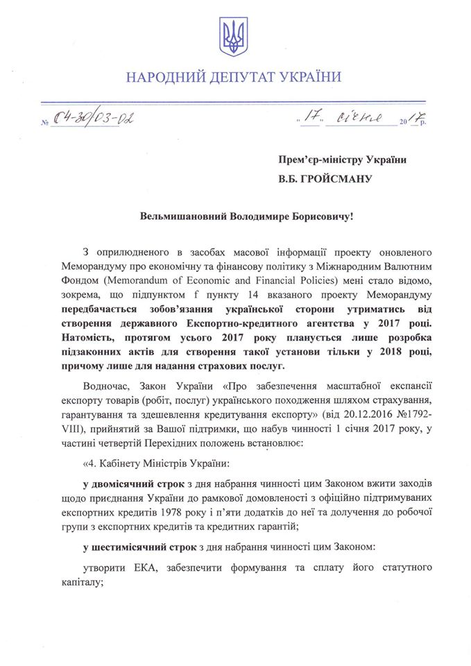 “Хтось з урядовців-компрадорів, серед інших невигідних Україні позицій, вписав в проект Меморандуму МВФ до пункту 14 зобов’язання української сторони утриматись від створення державного Експортно-кредитного агентства у 2017 році. Натомість, протягом усього 2017 року вони планують лише розробку підзаконних актів для створення такої установи тільки у 2018 році, при чому лише для надання страхових послуг”, - поінформував нардеп від РПЛ, звернувшись до Прем'єр-міністра України Володимира Гройсмана з вимогою негайного припинення порушення законності.