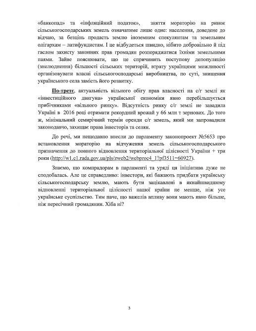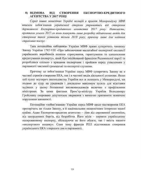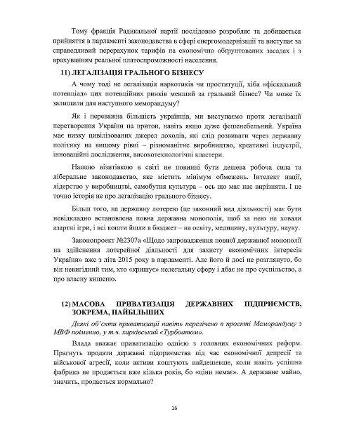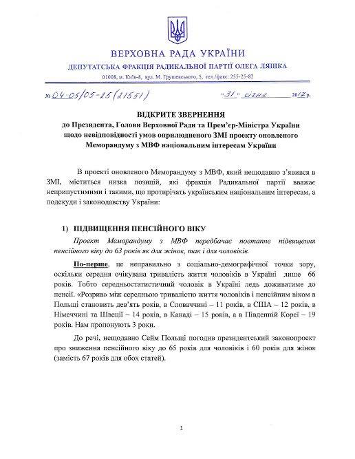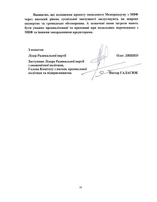 «Розміщую повний текст нашого з колегою Viktor Halasiuk звернення до Президента, Прем’єра і Спікера парламенту щодо неприпустимості підписання оновленого Меморандуму МВФ в запропонованій редакції. Адже він заблокує економічний розвиток країни і залишить громадян в бідності не тільки сьогодні, а й на перспективу. Радикальна партія пропонує інший план розвитку економіки та країни. Він реально поліпшить життя кожного», - написав нардеп.