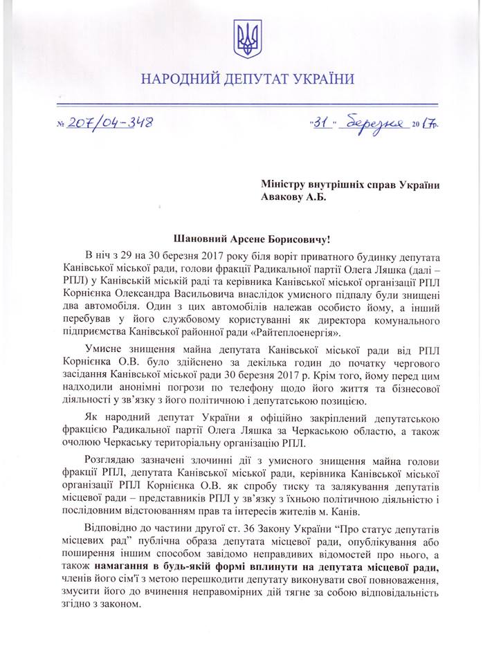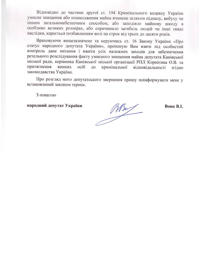"Щойно направив Міністру внутрішніх справ України А. Авакову моє депутатське звернення з вимогою взяти під особистий контроль і вжити усіх належних заходів для забезпечення ретельного розслідування факту умисного знищення майна - підпалу вночі біля будинку двох автомобілів - голови фракції РПЛ, депутата Канівської міської ради, керівника Канівської міської організації РПЛ Олександра Корнієнка та притягнення винних осіб до кримінальної відповідальності згідно законодавства України", - написав на своїй сторінці у Facebook Віктор Вовк.