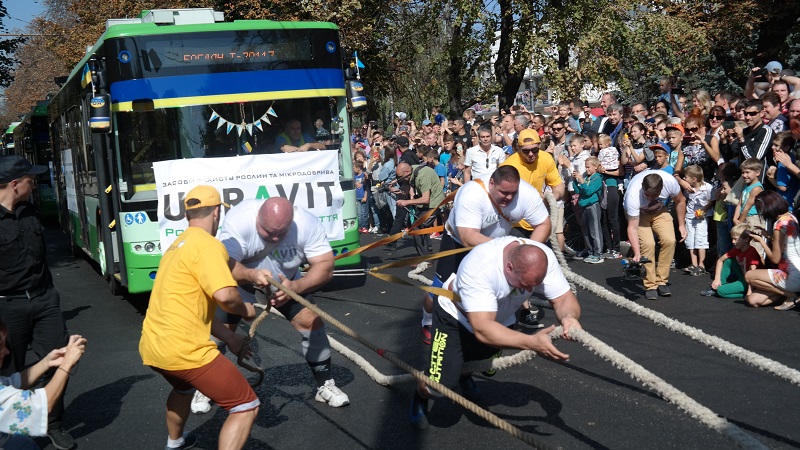 На цьому богатирі не зупинились і продовжили показові виступи із силових вправ, зокрема перетягування маршрутки «Богдан» з пасажирами.