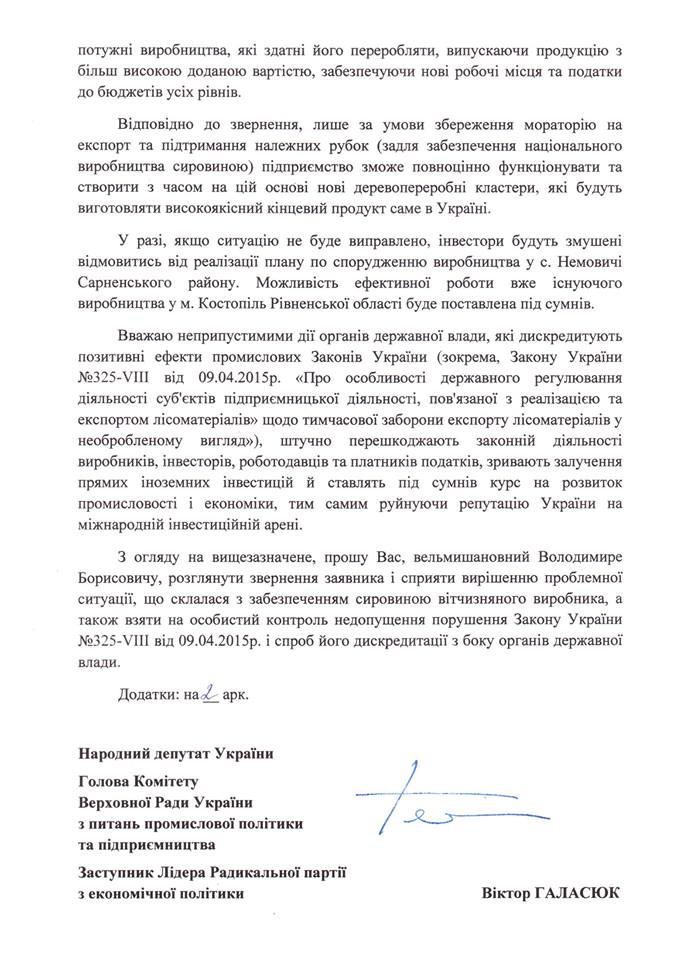 Крім того, В.Галасюк наголосив на штучному створенні органами влади та лісгоспами дефіциту деревини на внутрішньому ринку, «щоб показати мовляв “хоч мораторій і діє, проте проблему гарантованого постачання сировини він не вирішує, тож давайте його відмінимо”: «Заради цього вони здатні залишити одного з найбільших європейських інвесторів в українську деревообробку без сировини! До мене звернувся Йохан Дунбек, той самий шведський інвестор в “Українські лісопильні”, який “з нуля” створив сучасний завод на Рівненщині, інвестувавши 20 млн Євро. Планує вкласти ще 25 млн Євро та запустити ще одне виробництво, але навіть для вже збудованого заводу йому не продають необхідних обсягів сировини».
