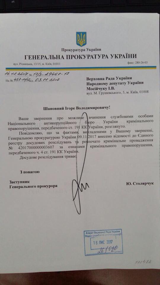 За зверненням народного депутата від Радикальної партії Ігоря Мосійчука Генеральною прокуратурою порушене кримінальне провадження щодо керівництва НАБУ. Про це політик повідомив на своїй сторінці у Facebook.