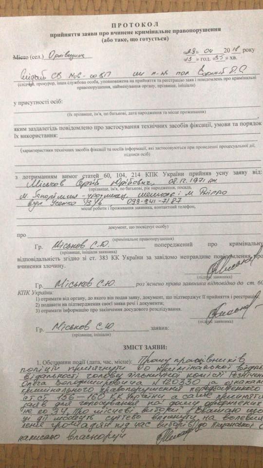 В селі  Орлівщина Новомосковськго району поліцією складено протокол про грубі порушення, виявлені на дільниці № 120 330. Кандидат в депутати від РПЛ Сергій  Миськовий зафіксував порушення. Він разом з спостерігачами переглянув  бланки заяв голосування на дому, виявив, що 59 заяв були надруковані на комп'ютері. Вісім - одним почерком. Всього в селі на дому голосували 68 осіб.