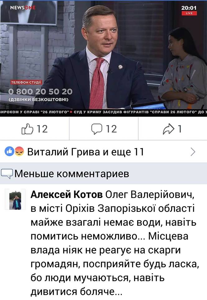 У прямому ефірі одного з центральних телеканалів до лідера Радикальної партії Олега Ляшка звернувся мешканець міста Оріхів Запорізької області Олександр Котов з проханням допомогти вирішити питання з водопостачанням в місті.