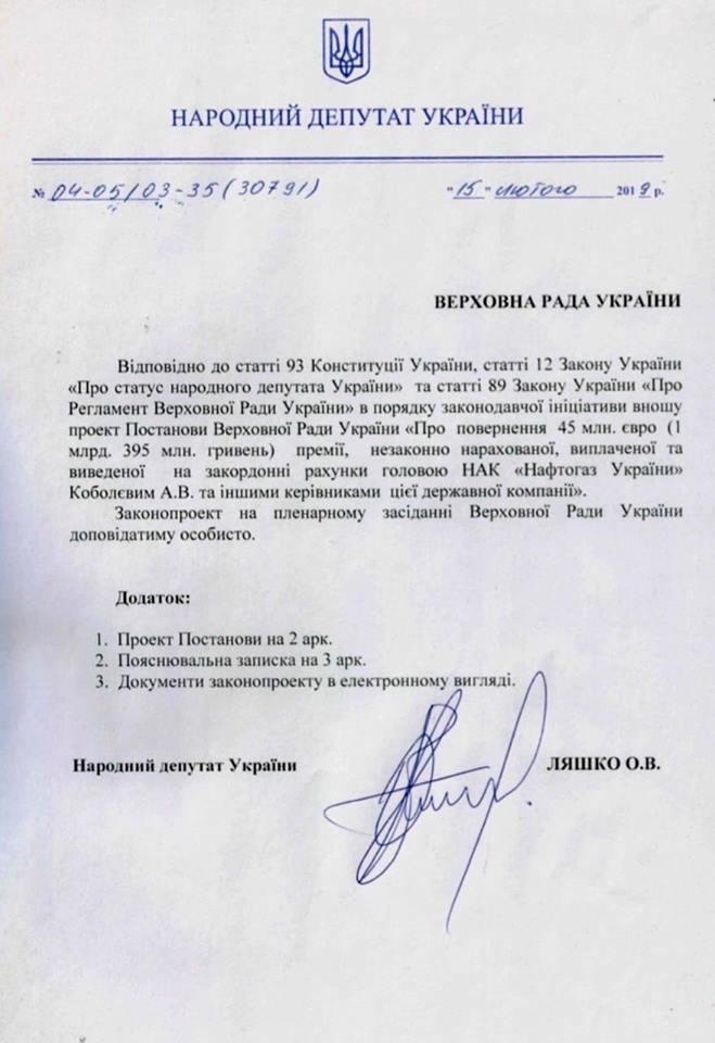 Зобов’язати керівництво «Нафтогазу» повернути до держбюджету 45 млн. євро  (1 млрд 395 млн грн)  премії, не продовжувати контракт з Андрієм Коболєвим та притягти його до кримінальної  відповідальності - вимагає у своєму проекті постанови Олег Ляшко. Політик наголошує: премії за перемогу у Стокгольмському арбітражі у справі проти «Газпрому» керівниками «Нафтогазу» отримані та виведені на закордонні рахунки, хоча ніякої матеріальної компенсації від російської компанії Україна ще не побачила.