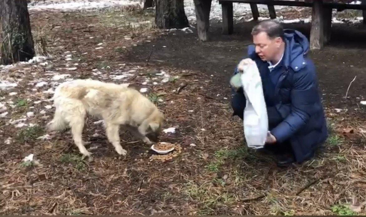 Повертаючись із зустрічей з людьми на Черкащини, Олег Ляшко зупинився прямо на дорозі, щоб погодувати безпритульного собаку. Політик дістав із машини сухий корм, який постійно возить із собою, та насипав песику. На відео, яке народний депутат розмістив на своїй сторінці у Facebook, видно, що чотирилапий від голоду ледь миску не ковтнув.